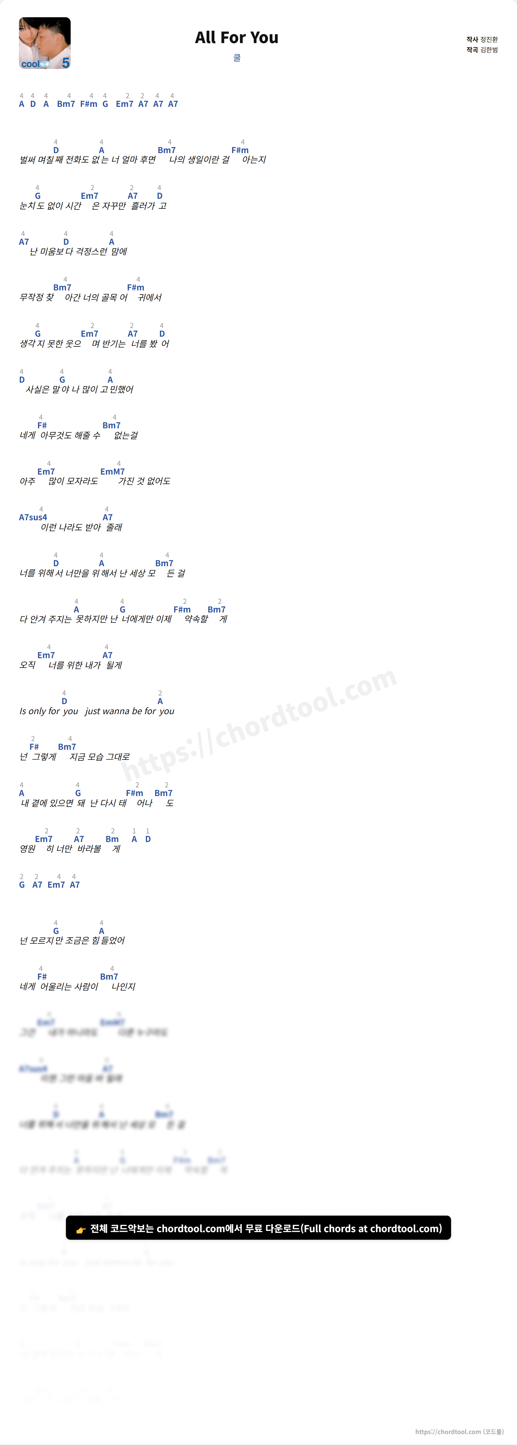 쿨의 All For You 가사를 확인할 수 있습니다. 곡 정보와 함께 연주에 필요한 코드, 악보 제공 여부도 함께 정리했습니다.