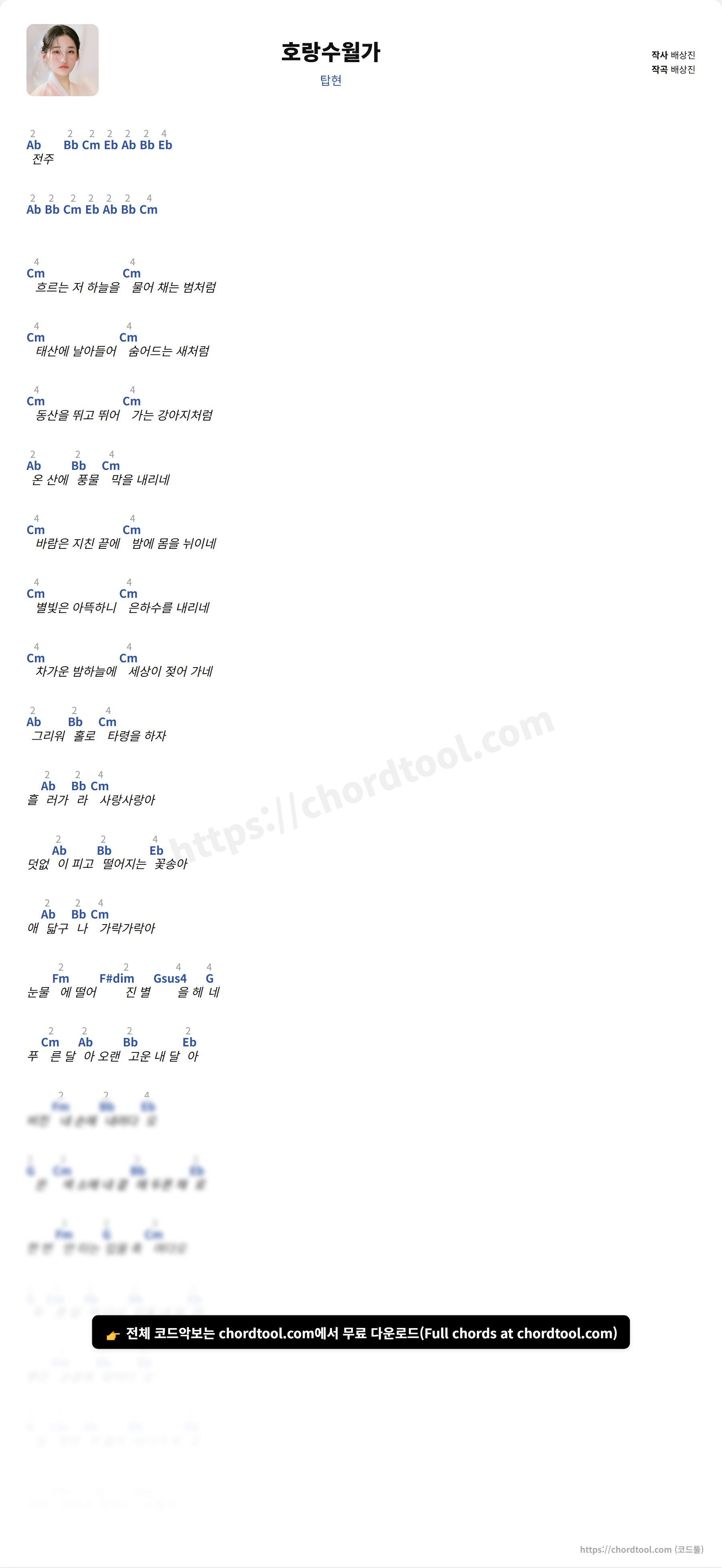 탑현의 호랑수월가 가사를 확인할 수 있습니다. 곡 정보와 함께 연주에 필요한 코드, 악보 제공 여부도 함께 정리했습니다.