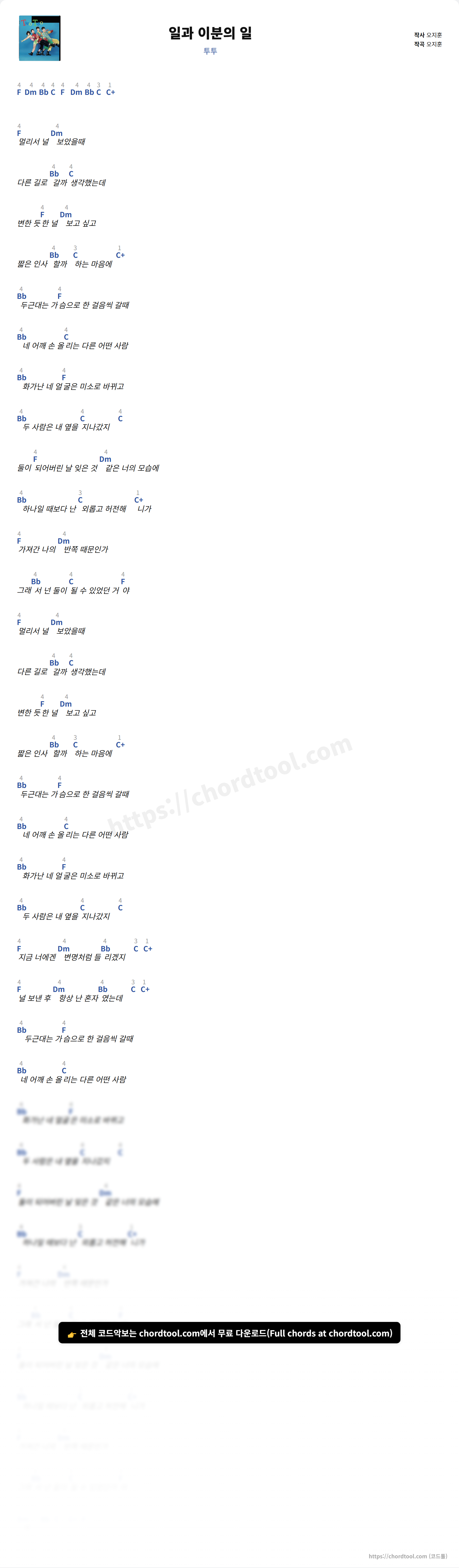 투투의 일과 이분의 일 가사를 확인할 수 있습니다. 곡 정보와 함께 연주에 필요한 코드, 악보 제공 여부도 함께 정리했습니다.