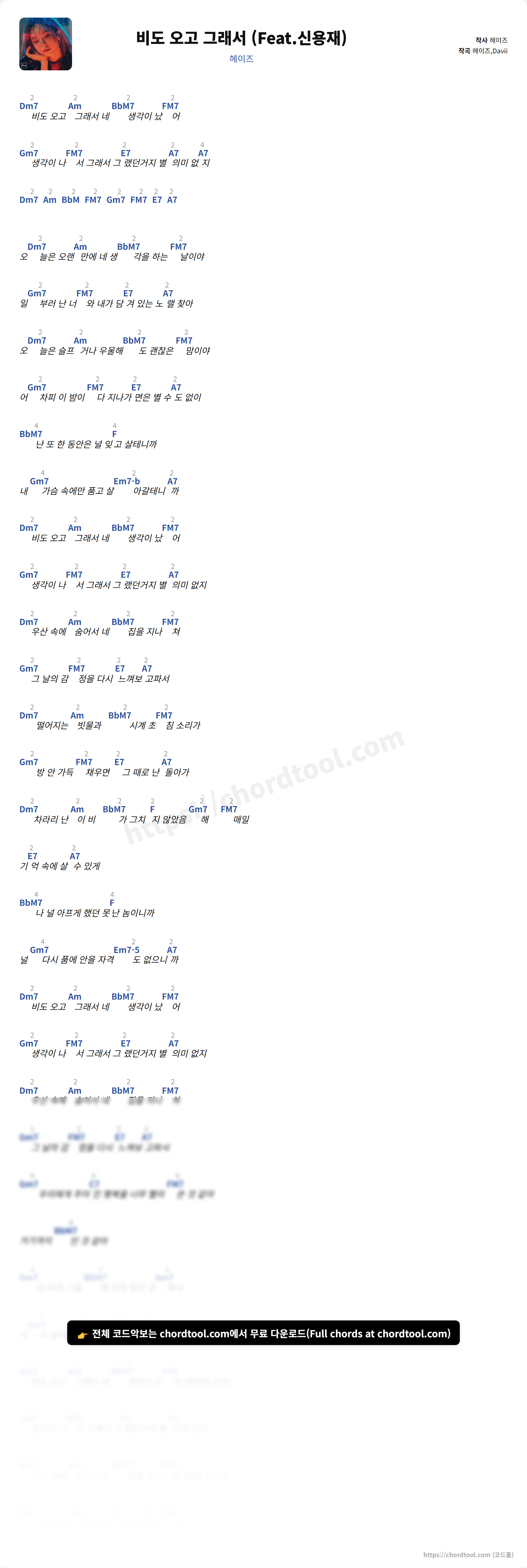 헤이즈의 비도 오고 그래서 (Feat.신용재) 가사를 확인할 수 있습니다. 곡 정보와 함께 연주에 필요한 코드, 악보 제공 여부도 함께 정리했습니다.