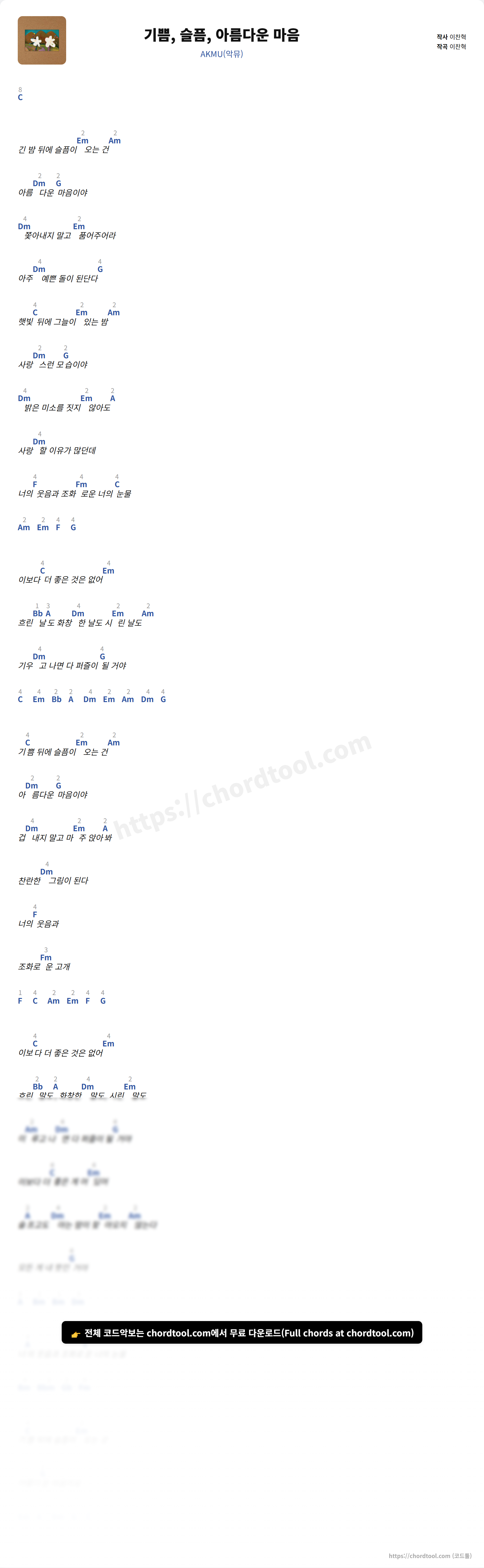 AKMU(악뮤)의 기쁨, 슬픔, 아름다운 마음 가사를 확인할 수 있습니다. 곡 정보와 함께 연주에 필요한 코드, 악보 제공 여부도 함께 정리했습니다.