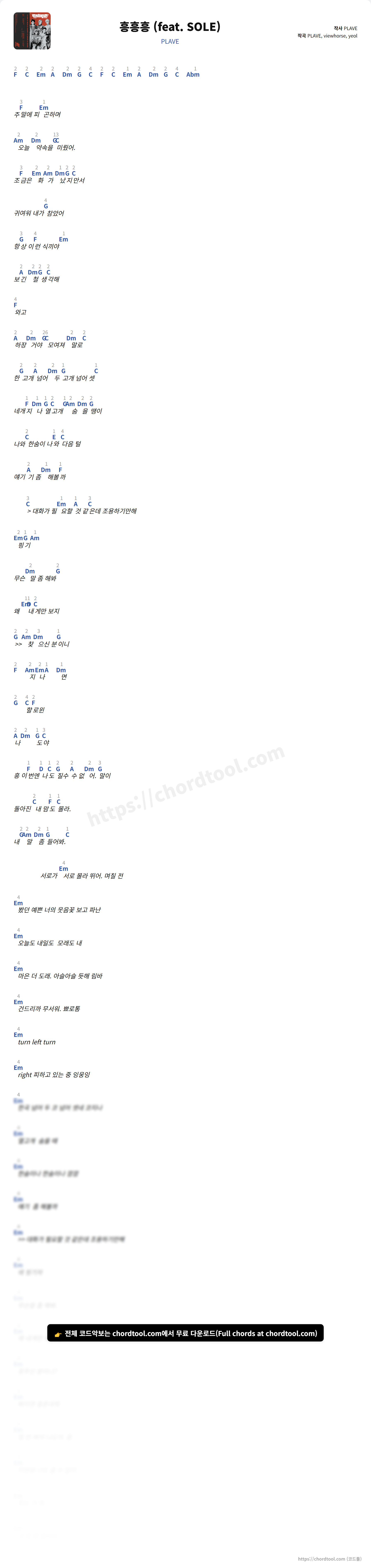 PLAVE의 "흥흥흥 (feat. SOLE)" 가사 페이지입니다. 곡 정보와 함께 코드 진행, 악보 제공 여부를 한눈에 확인할 수 있도록 구성했습니다. 원키는 Cm입니다. 현재 코드악보가 제공되고 있으며 다양한 악기 코드표도 확인 가능합니다. |